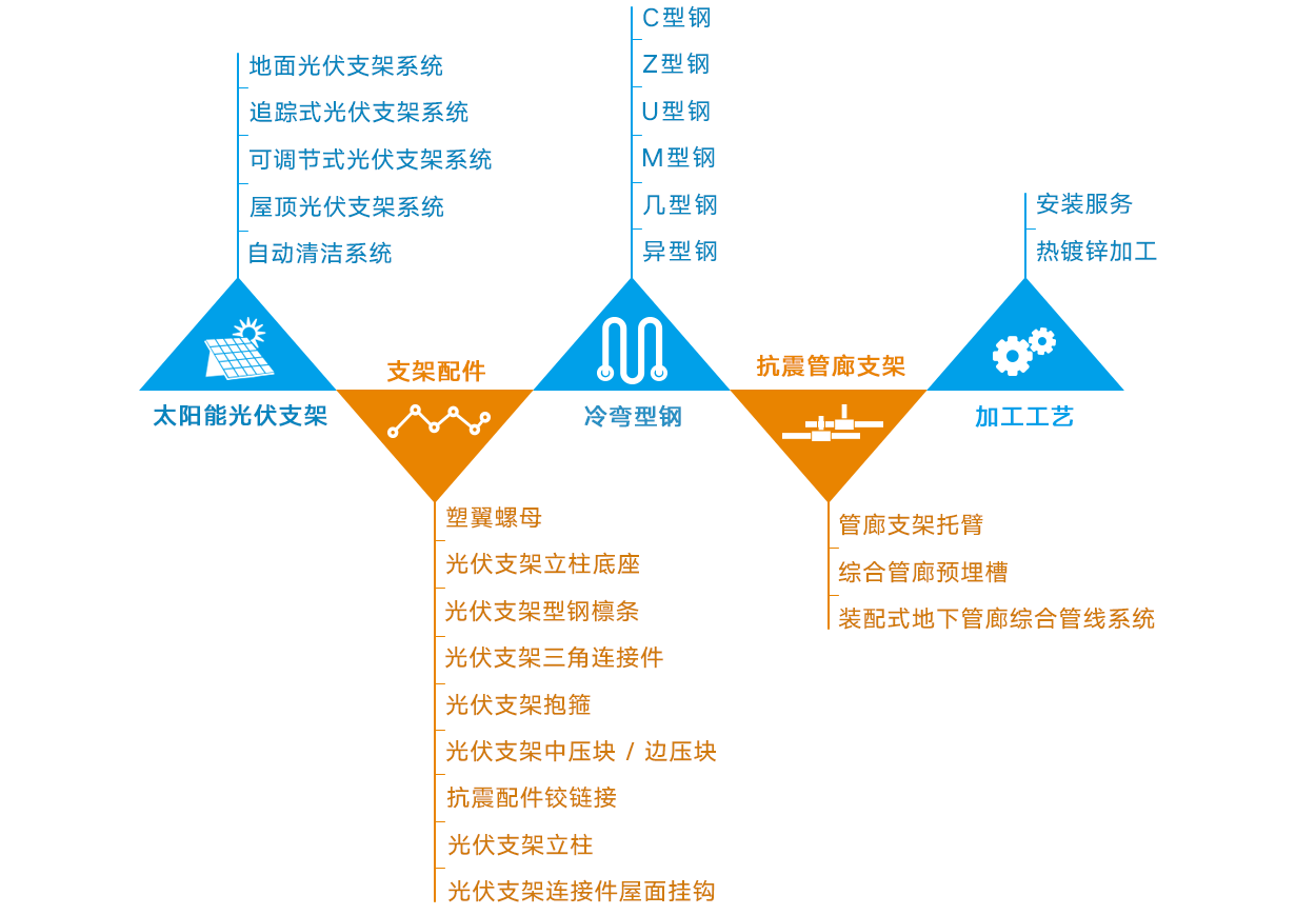公司始終專注于生產(chǎn)太陽能光伏支架及支架配件(地面支架系統(tǒng)、屋頂支架系統(tǒng)、可調(diào)節(jié)式支架系統(tǒng)、追蹤式支架、自動清潔系統(tǒng)等),C、Z、U、M、幾、異型、等冷彎型鋼,管廊抗震支架、代理熱鍍鋅加工、安裝等服務。