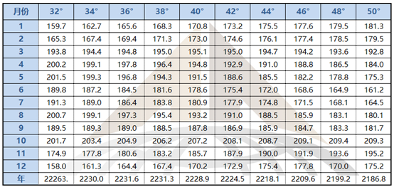 表2列出了該地區(qū)各月光伏板最佳傾斜角度。 若選擇一年調(diào)節(jié)2次的方案,則每年10月至次年3月為一個角度,此角度在不考慮土地因素的情況下,可在《光伏發(fā)電站工程項目用地控制指標(biāo)》的范圍內(nèi)盡可能選擇大的。每年4月~8月為一個角度,還以上述地區(qū)為例,最佳角度為9°。